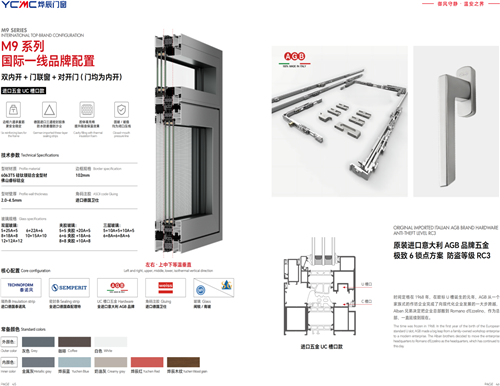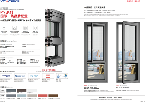 · 一体/分体五金双飞翼门 + 对开门 + 单体窗/双内开窗:代表M9系列的巅峰设计。通过隐藏式五金联动,实现单点执手控制双扇门同步开启,带来震撼的仪式感与无敌视野。