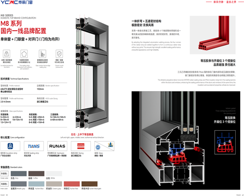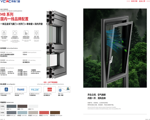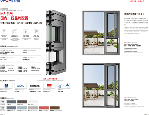 · 一体/分体五金双飞翼门 + 对开门 + 单体窗/双内开窗:此系统将M8系列的创新性推向高峰。通过隐藏式联动机构,实现单点控制双门开启,营造开阔震撼的空间感。